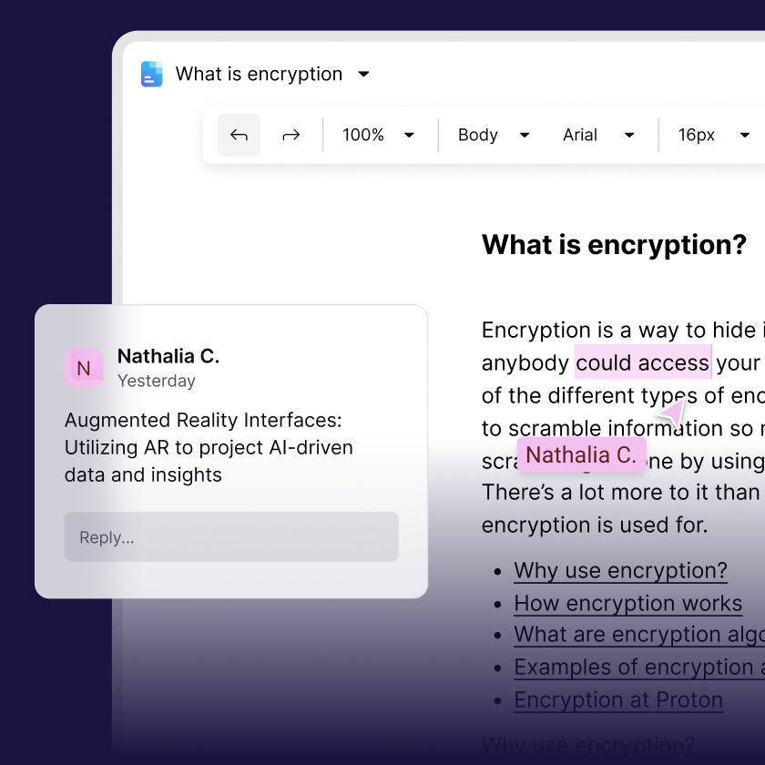 Type up meeting minutes, draft strategic documents, and brief sensitive client projects with the confidence that not even Proton can access your data.