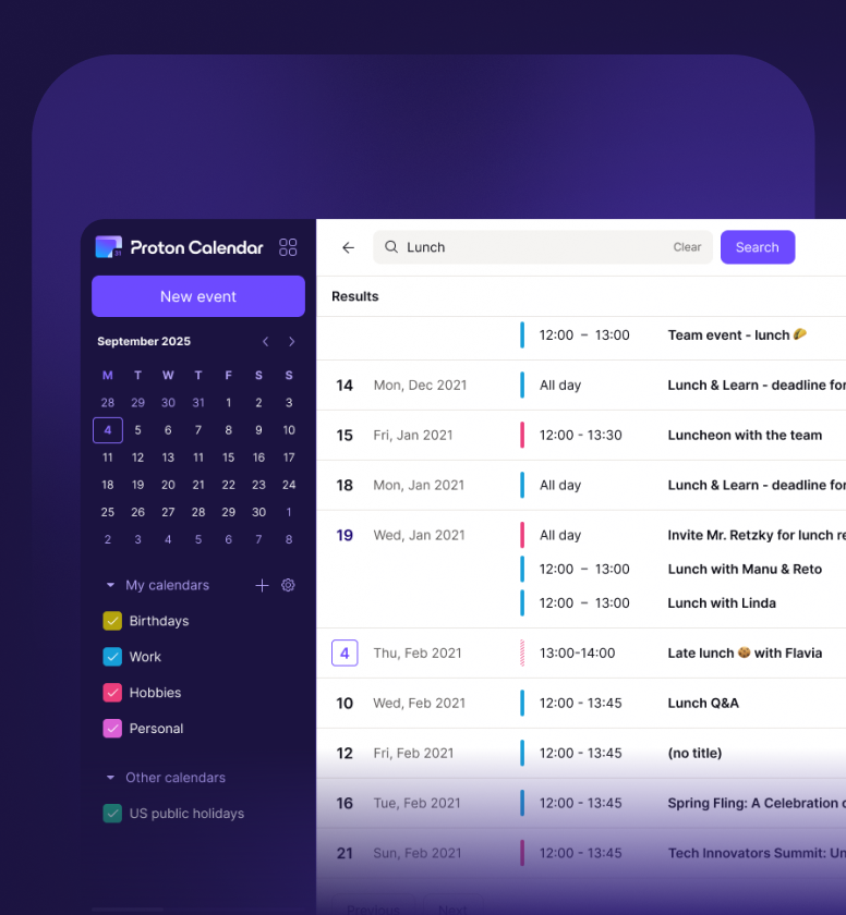 Manage schedules, share calendars, and book meetings securely with Proton Calendar.