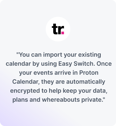 Migrate your existing team calendars, emails, and contacts securely to Proton with one click from any provider.