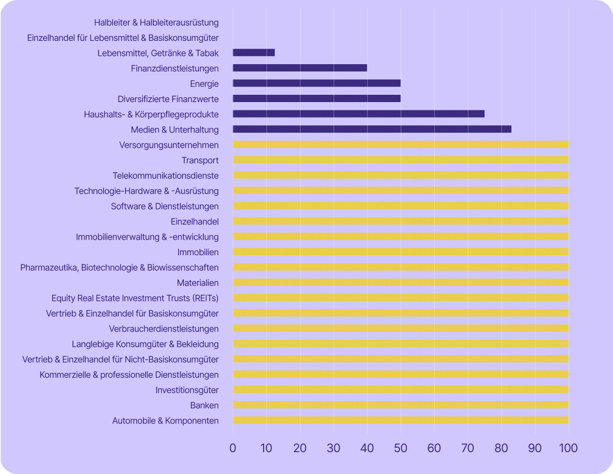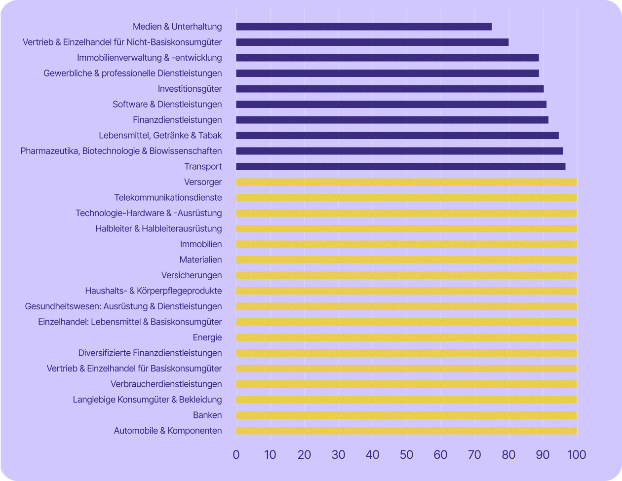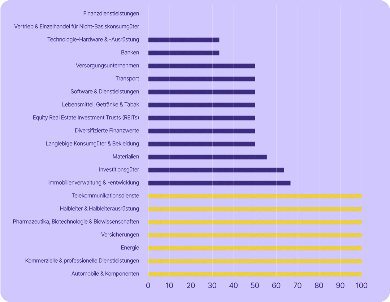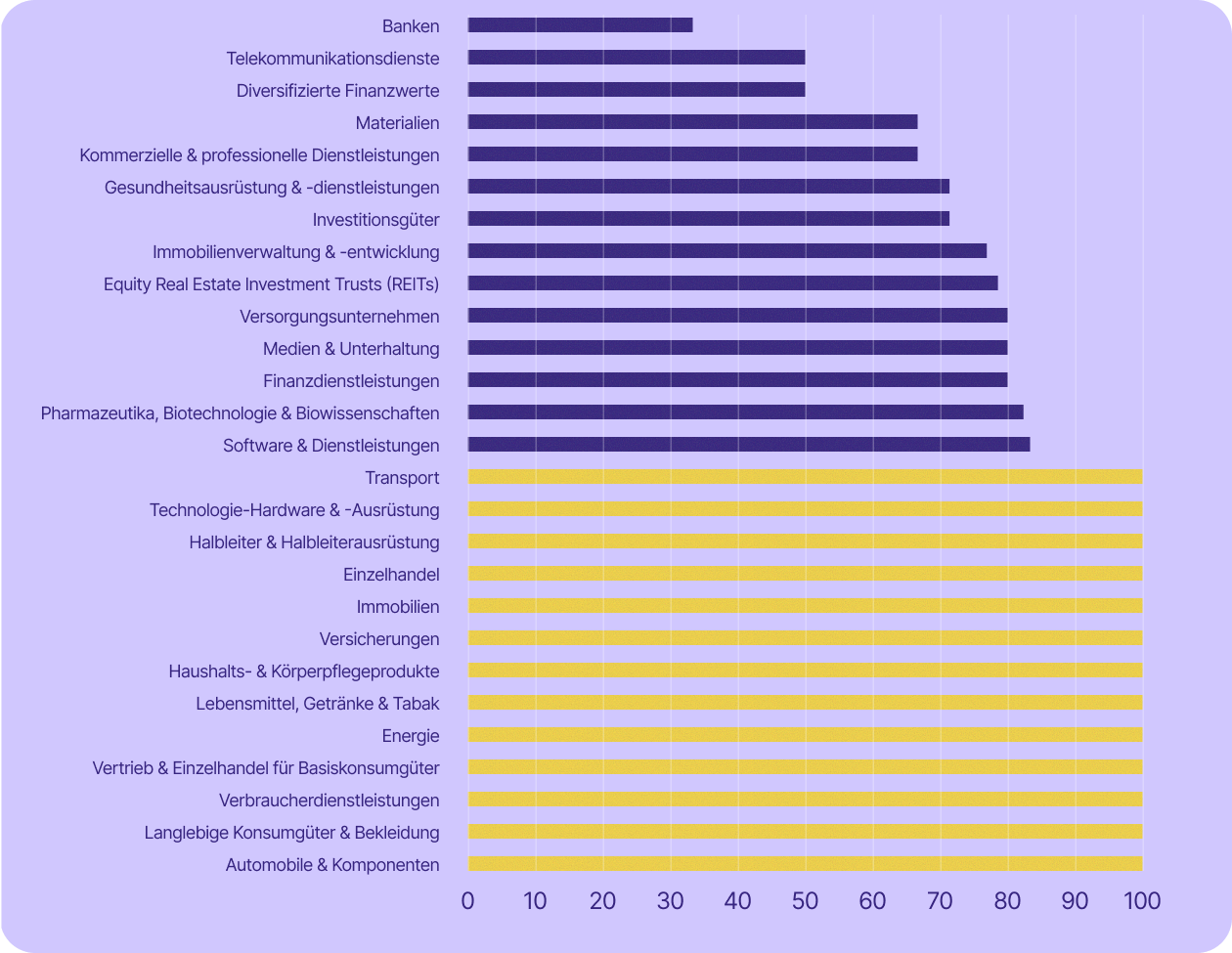Einige der für die Schweizer Wirtschaft wichtigsten Sektoren sind sogar noch stärker betroffen. Die Dienstleistungsbranche – zu der unter anderem Banken, Finanzwesen, Versicherungen und professionelle Dienstleistungen zählen – machte im Jahr 2023 rund 70 % des BIP aus und beschäftigte 2024 etwa 78 % der Erwerbstätigen. In fast allen diesen Branchen (mit Ausnahme von Banken) setzen mindestens 67 % der börsennotierten Unternehmen auf US-Technologie.
