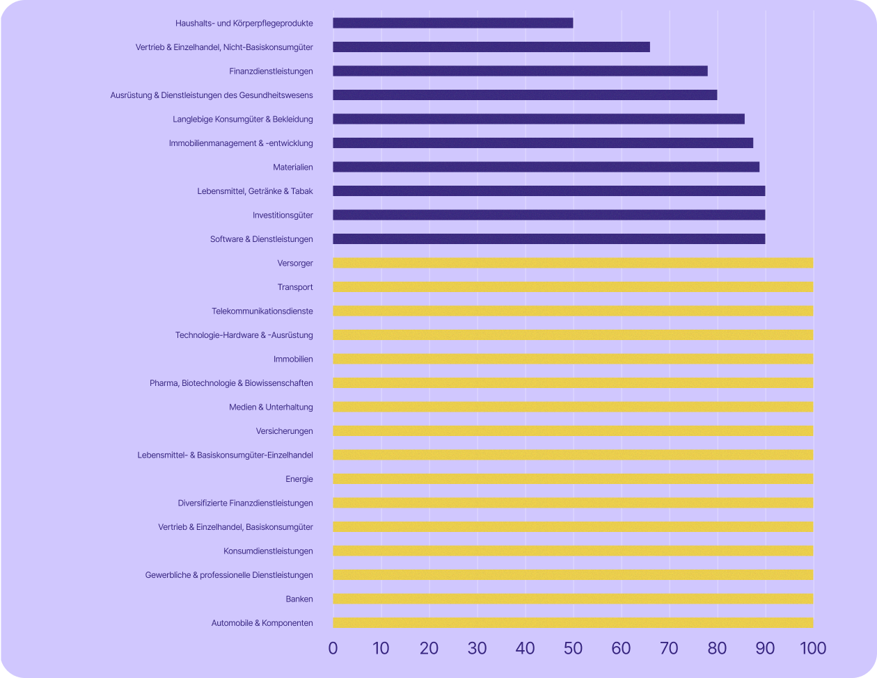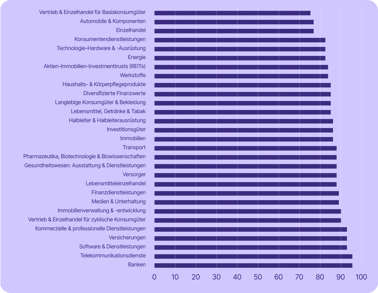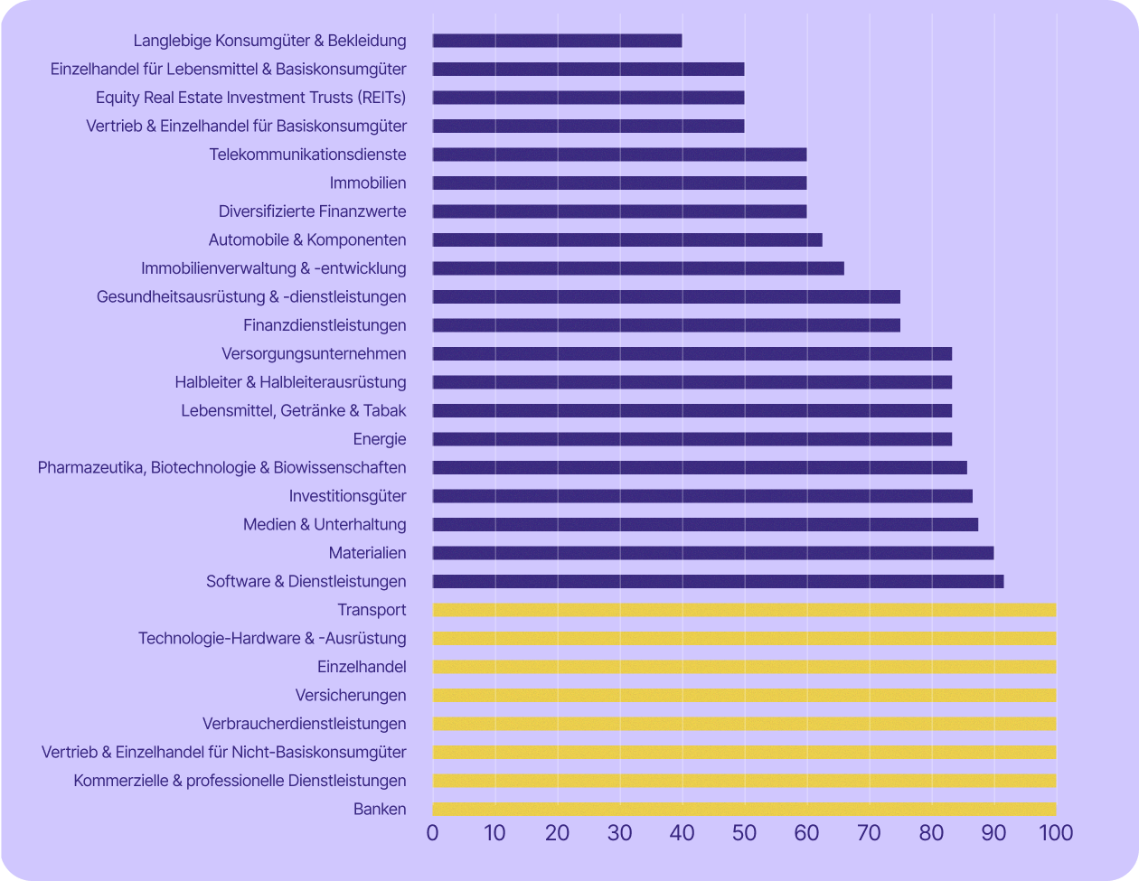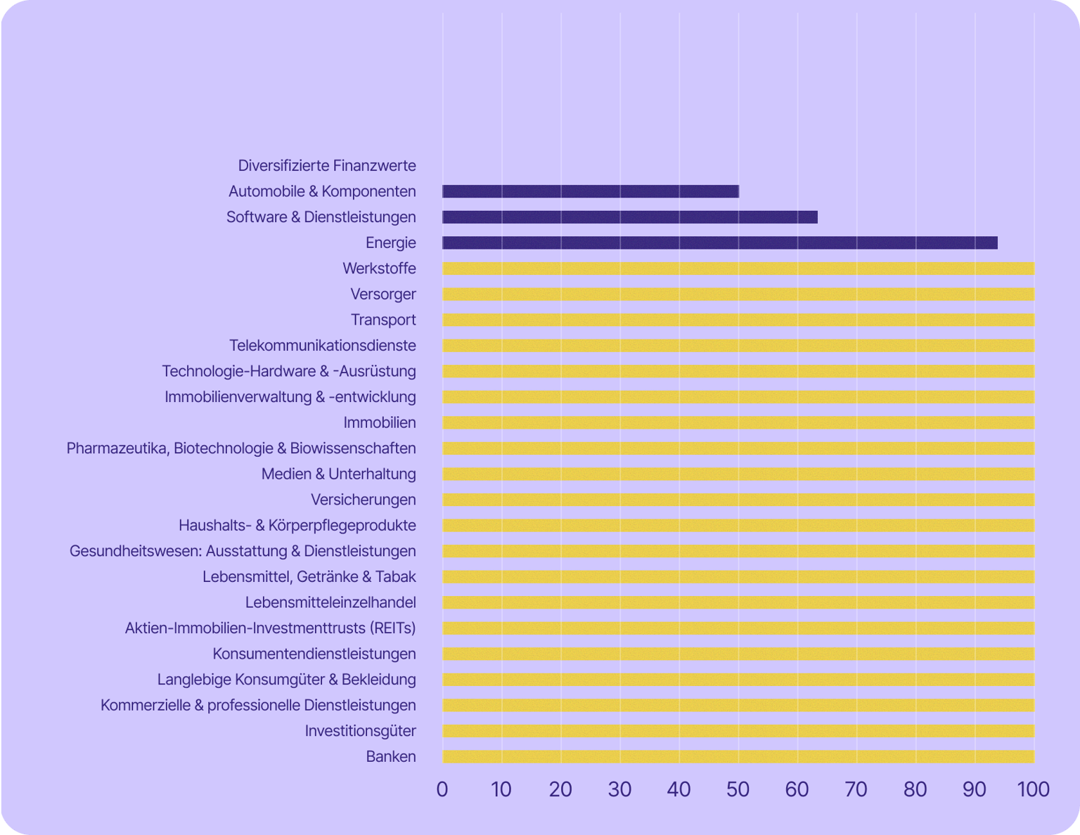 Einige der für die Schweizer Wirtschaft wichtigsten Sektoren sind sogar noch stärker betroffen. Die Dienstleistungsbranche – zu der unter anderem Banken, Finanzwesen, Versicherungen und professionelle Dienstleistungen zählen – machte im Jahr 2023 rund 70 % des BIP aus und beschäftigte 2024 etwa 78 % der Erwerbstätigen. In fast allen diesen Branchen (mit Ausnahme von Banken) setzen mindestens 67 % der börsennotierten Unternehmen auf US-Technologie.
