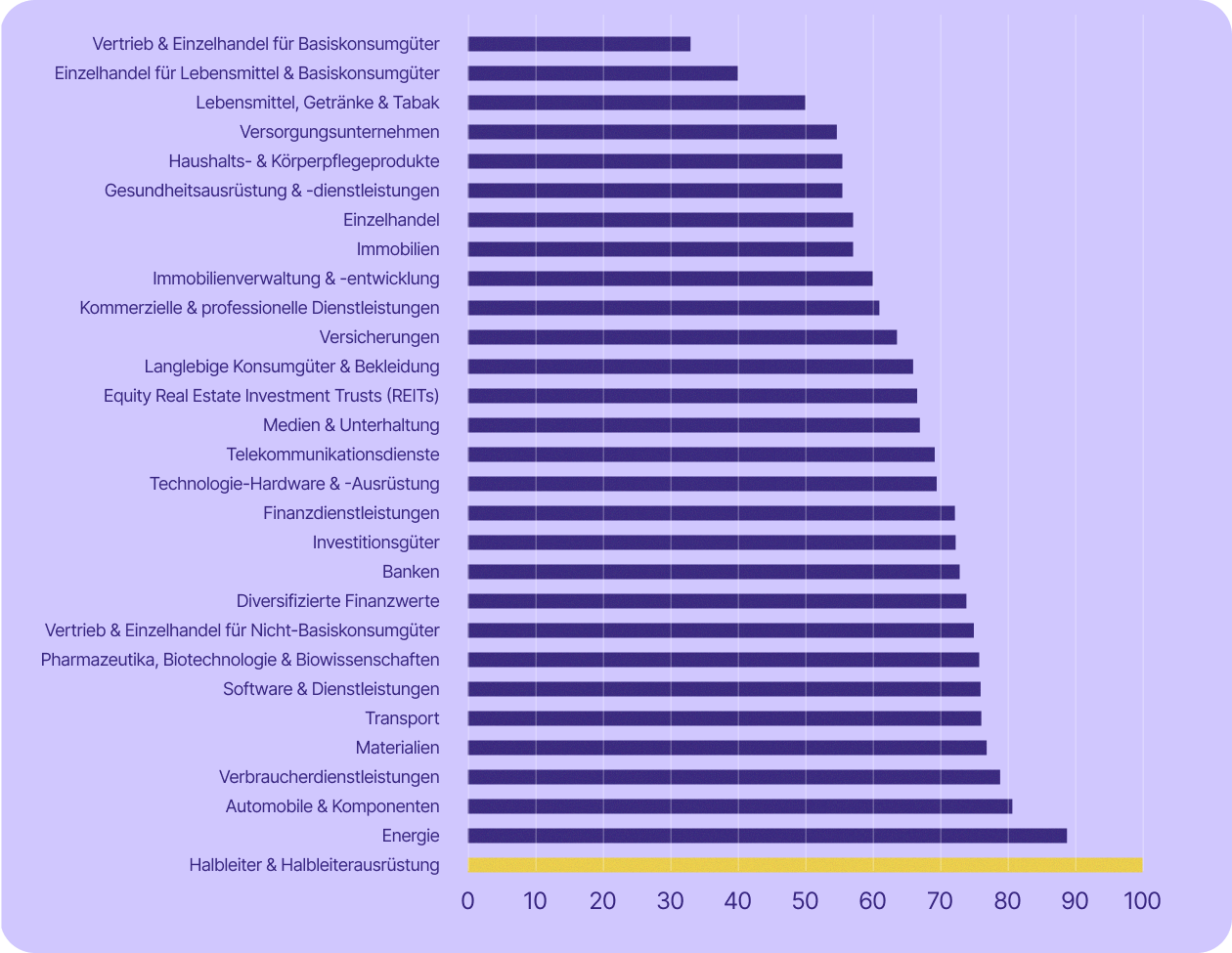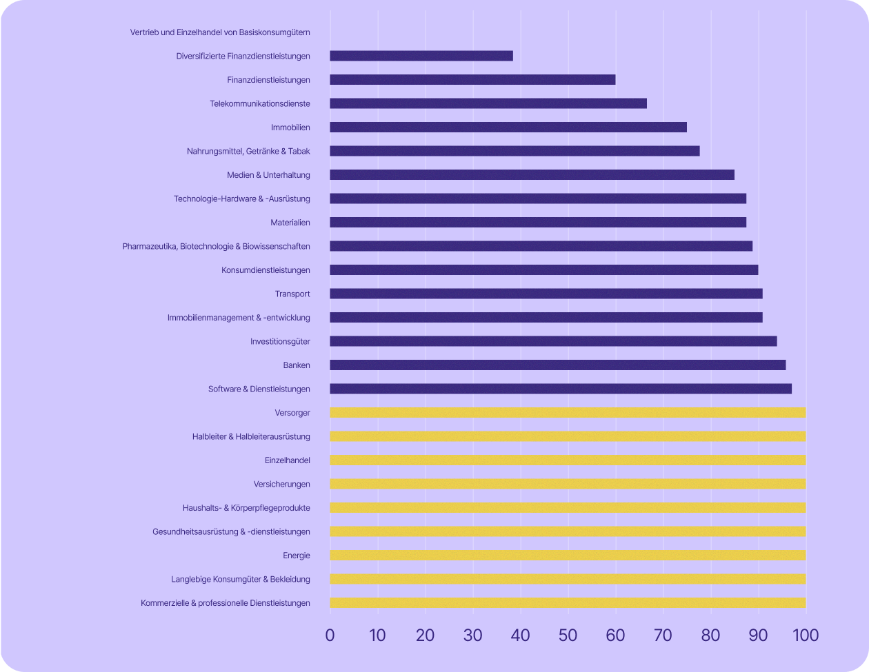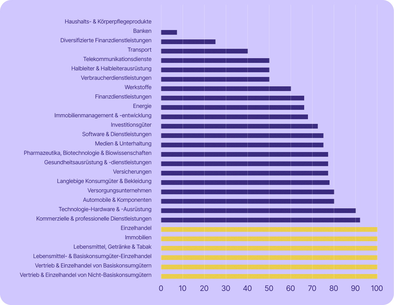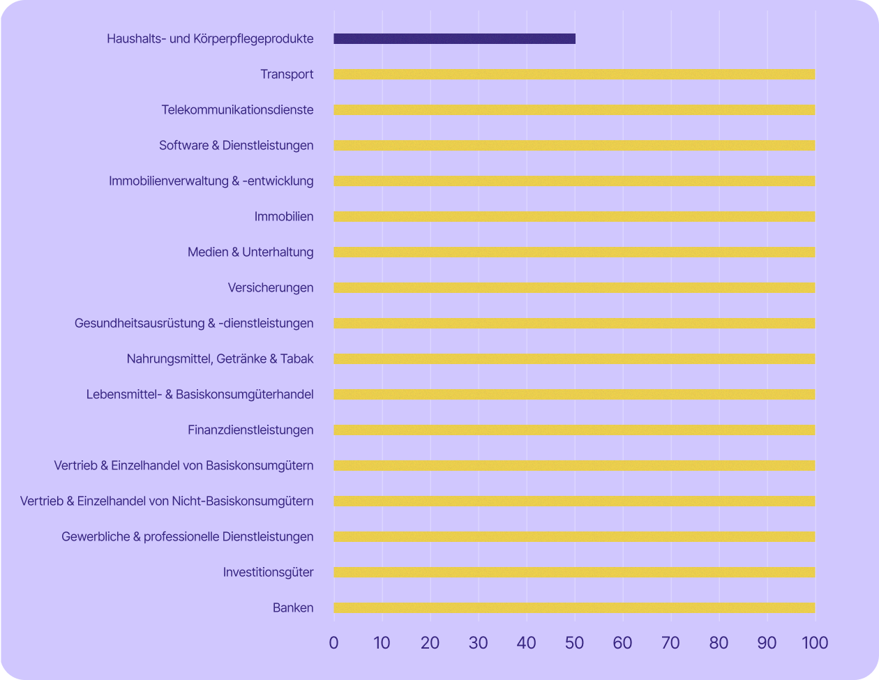 Einige der für die Schweizer Wirtschaft wichtigsten Sektoren sind sogar noch stärker betroffen. Die Dienstleistungsbranche – zu der unter anderem Banken, Finanzwesen, Versicherungen und professionelle Dienstleistungen zählen – machte im Jahr 2023 rund 70 % des BIP aus und beschäftigte 2024 etwa 78 % der Erwerbstätigen. In fast allen diesen Branchen (mit Ausnahme von Banken) setzen mindestens 67 % der börsennotierten Unternehmen auf US-Technologie.