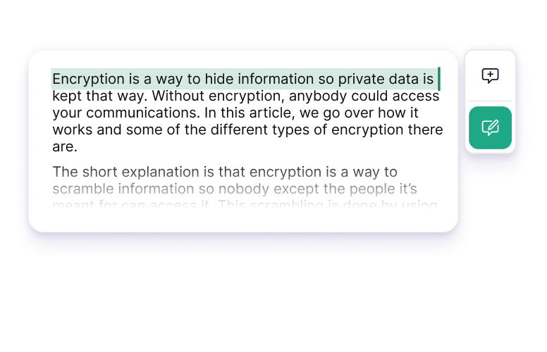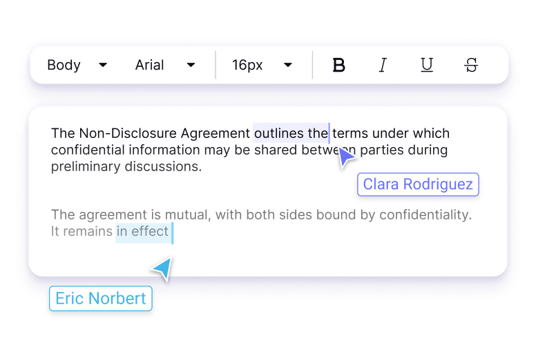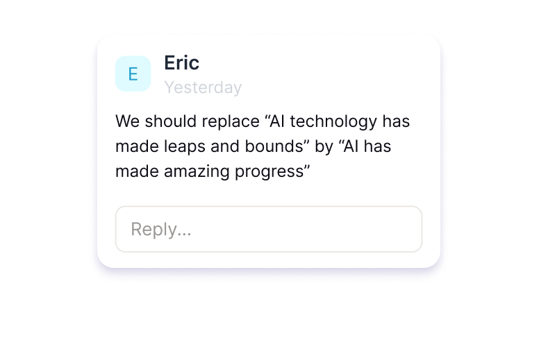 Let collaborators propose edits without changing the original text. Their suggestions appear as highlighted text, making them easy to review, accept, or reject.