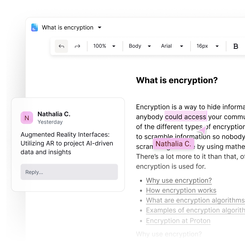 Protect your documents from data breaches, surveillance, and AI training with Proton Docs — the end-to-end encrypted, real-time collaborative document editor.