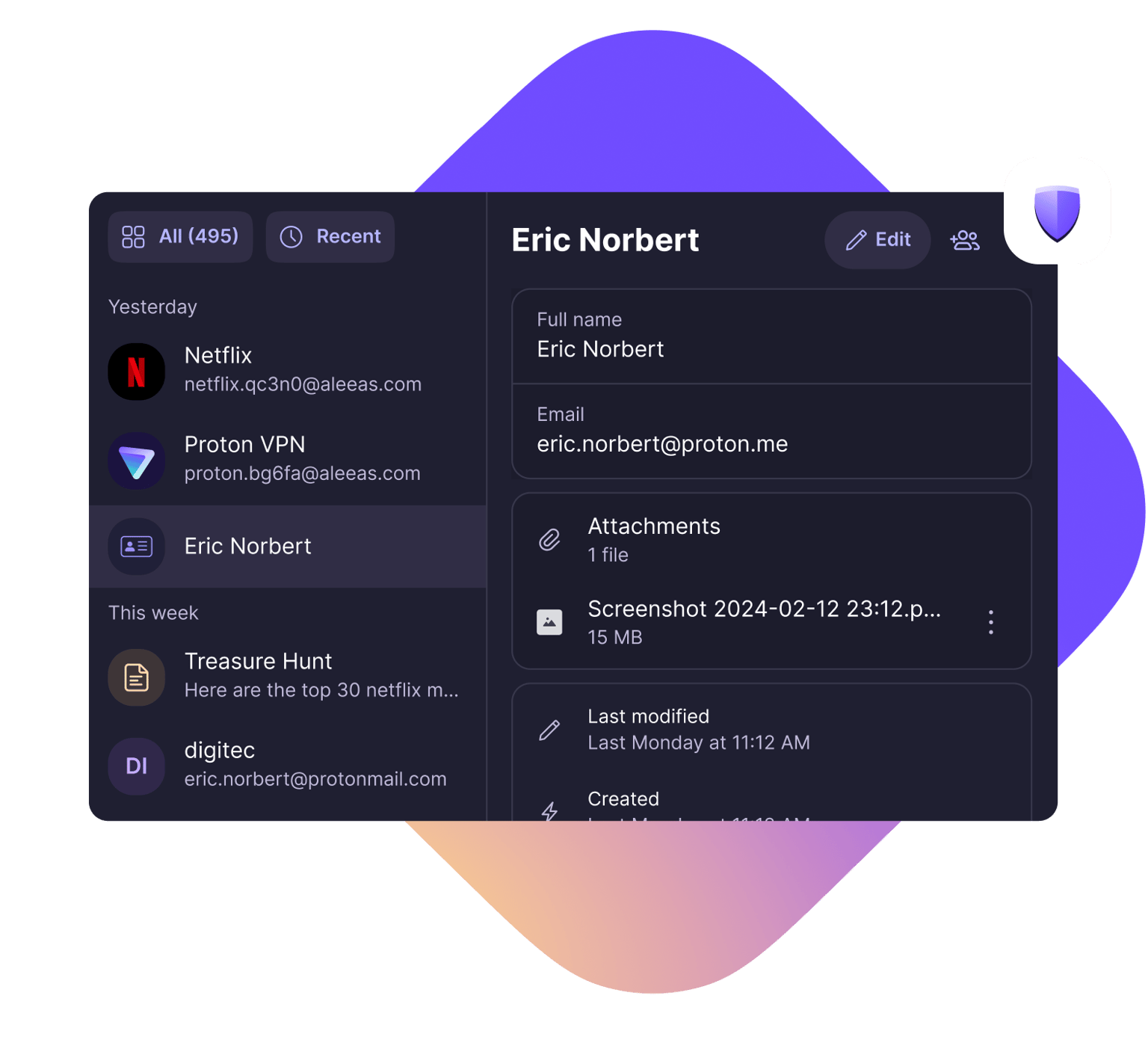 Proton Pass makes it simple to organize and simplify your digital life. When you create a password, Identity, or note in Proton Pass, you can also attach files, letting you store all the relevant information for a particular account in one secure place.