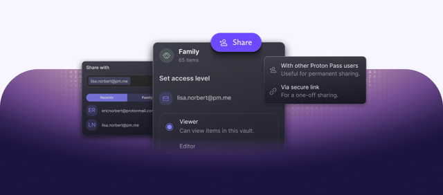 No more sharing passwords via email, chat or spreadsheets. With Proton Pass, you can share sensitive information securely, easily and with more control.