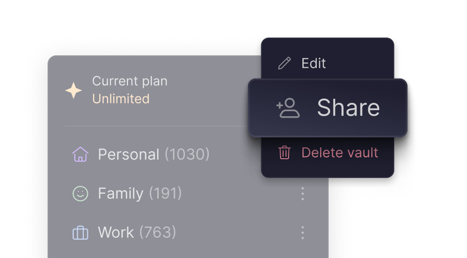 Securely share not only passwords but also other sensitive information, such as credit cards, notes, and hide-my-email aliases.