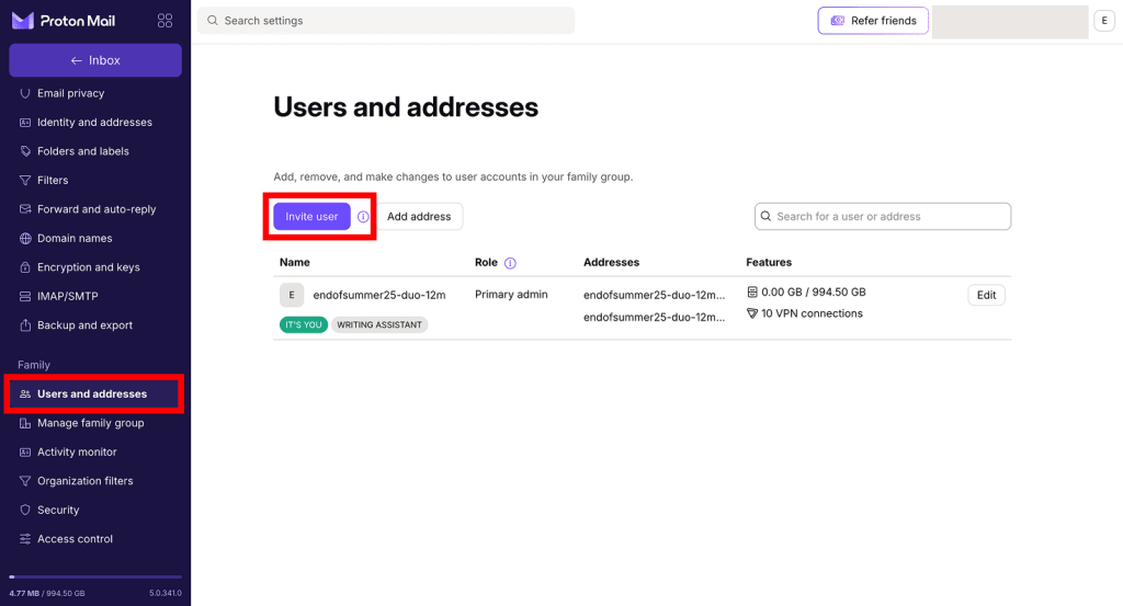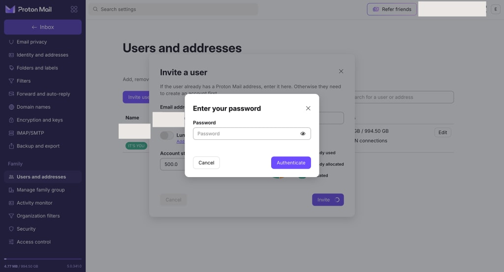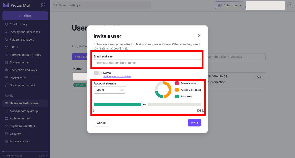 2. Enter your user’s email address (if they don’t have a Proton Mail address yet, they’ll need to create one), decide how much storage to allocate them, then click Invite.