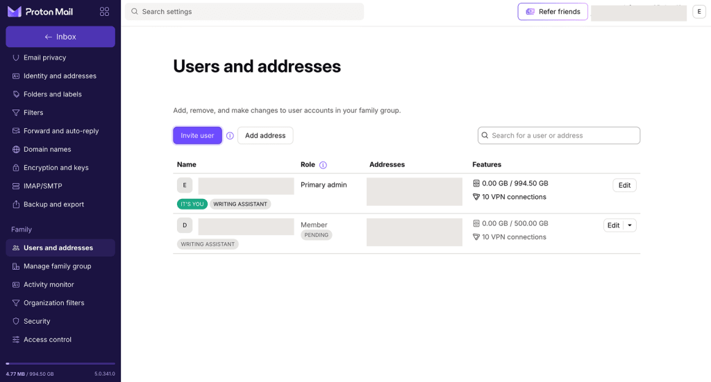 1. Go to Users and addresses (or click Settings → All settings → Family → Users and addresses). Find the family member whose storage space you’d like to change and click Edit.