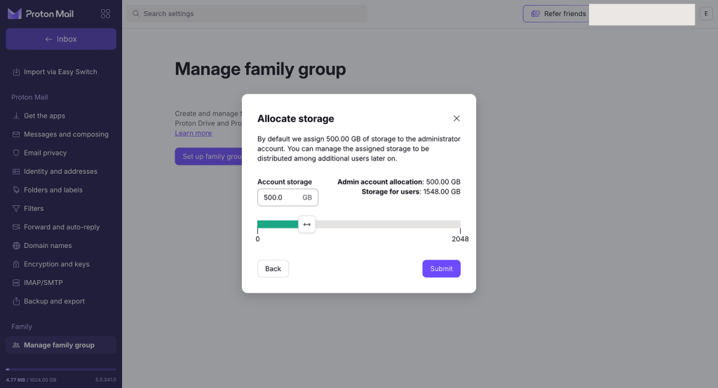 Proton Duo comes with 2 TB of storage to share between two users. You can always change your storage allocation later. When you’ve set your storage, click Submit.