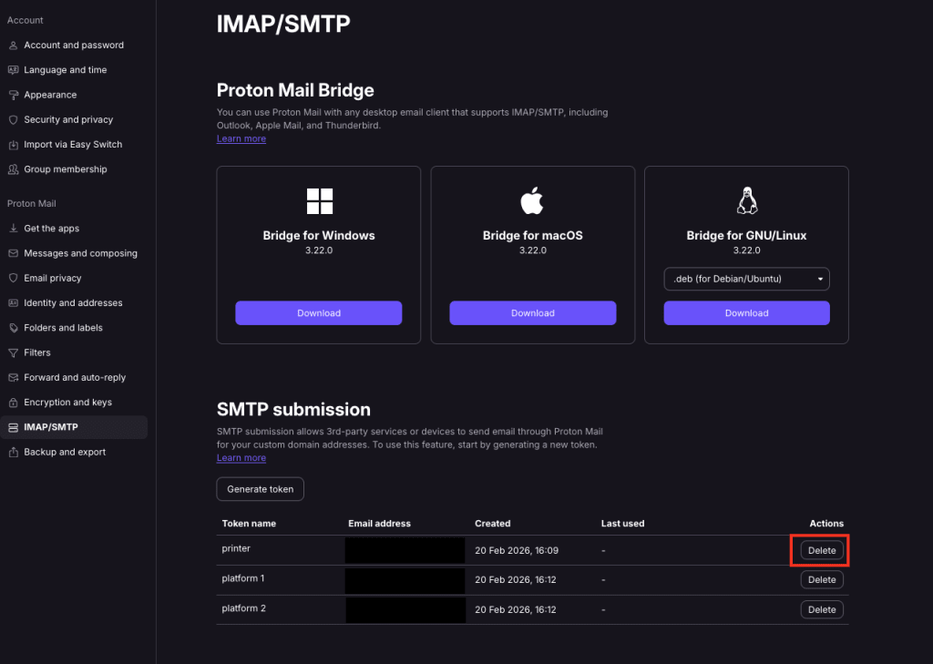 1. In your browser, sign in to your Proton Mail account and select Settings → All settings → IMAP/SMTP → SMTP tokens. You should be able to see all active SMTP tokens.