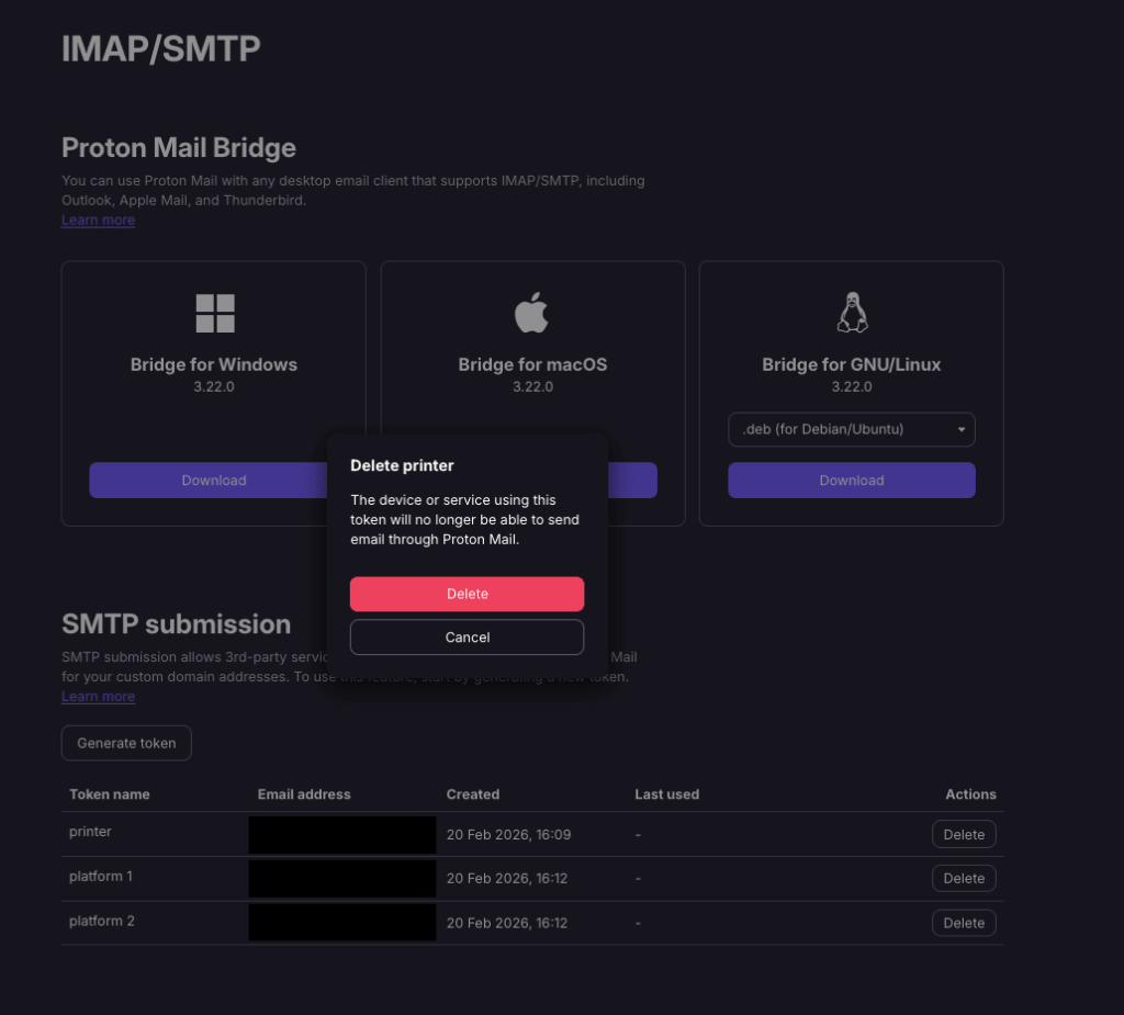 4. This token is now deleted. Any client with this token will no longer be able to send any emails from your Proton Mail address(es).